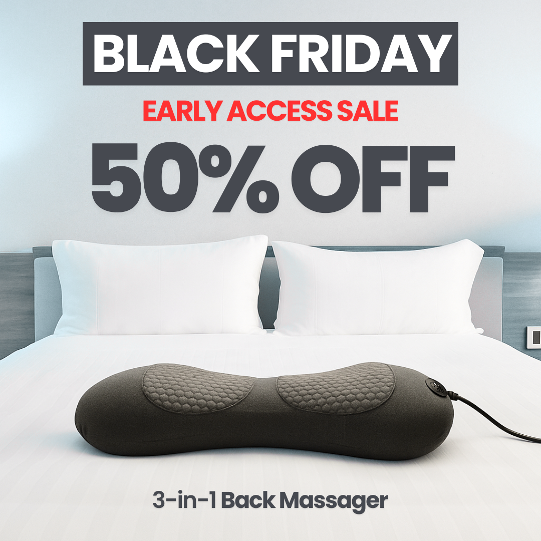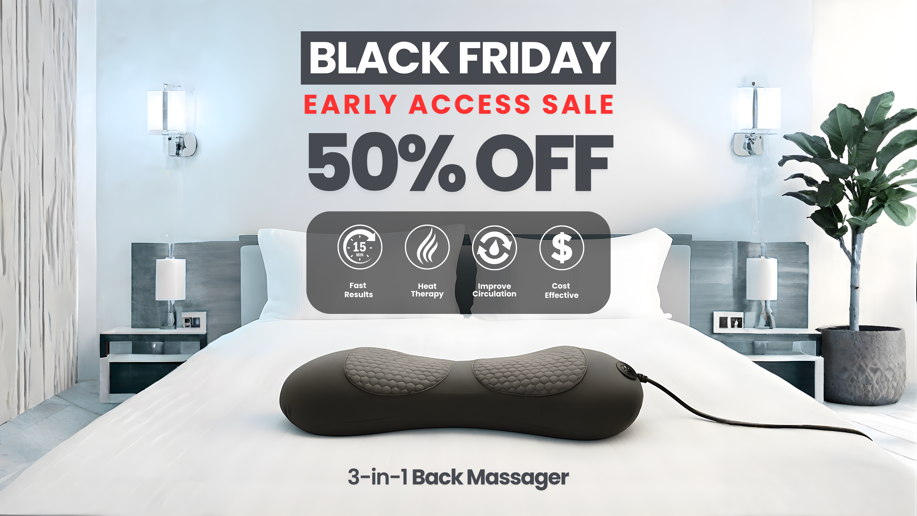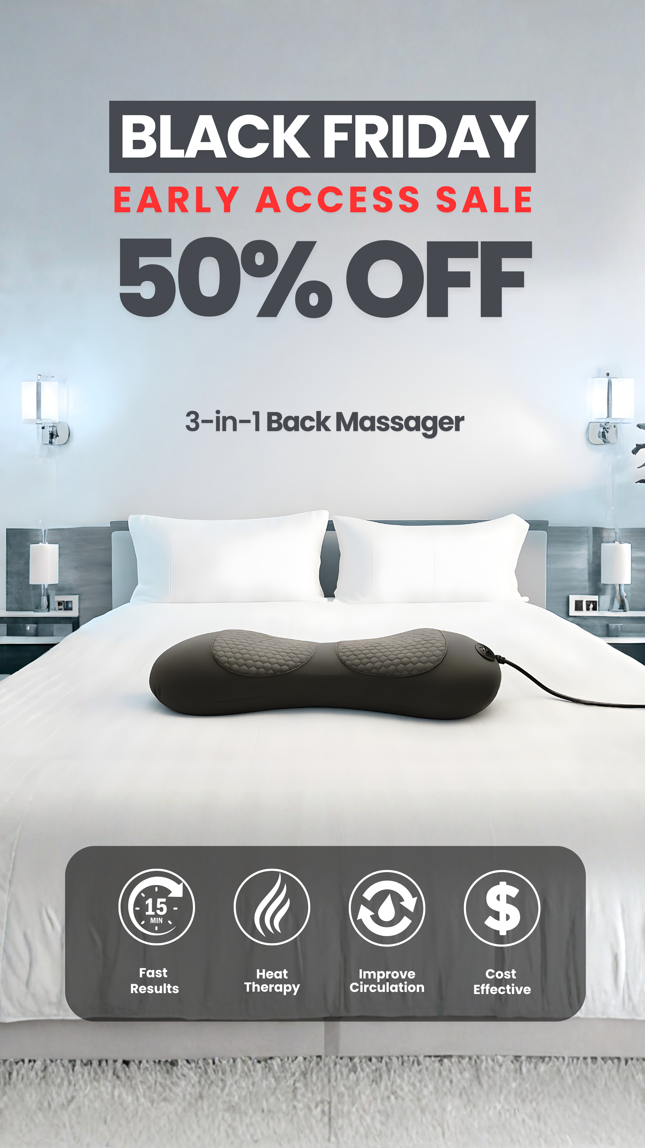Long hours and poor posture strain your spine, causing stiffness and discomfort. In just 15 minutes a day, the 3-in-1 Back Massager combines heat, vibration, and a gentle 26° stretch to realign your spine, improve circulation, and ease pain — for lasting relief and mobility.